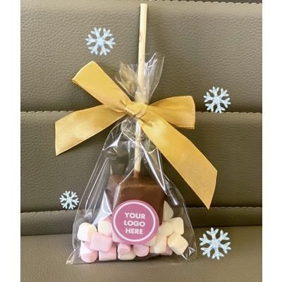 Belgian Milk Chocolate Cube on Wood Spoon. Bagged with Marshmallows. Minimum Quantity: 100.